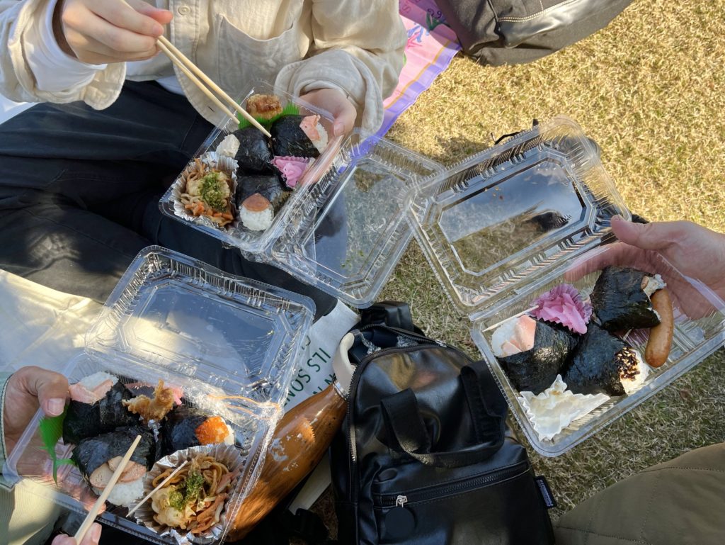お弁当&お菓子タイムは池田城跡公園の芝生で🍱🎶おなかペコペコ、あっという間に完食です😁👍