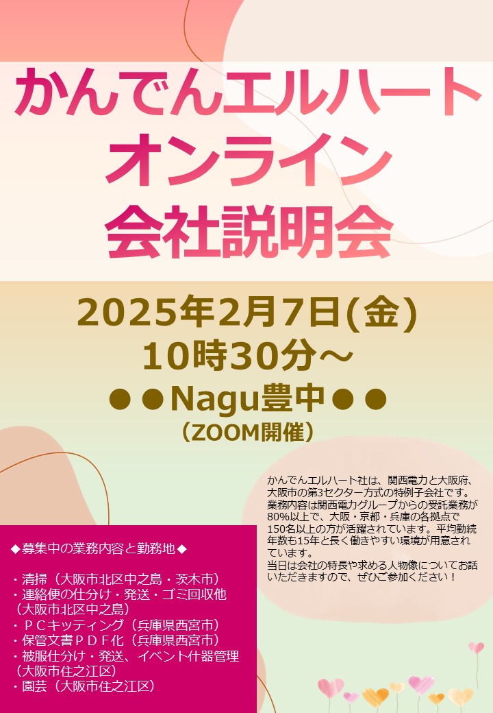 明日2/7(金) Nagu豊中で「かんでんエルハート」のオンライン企業説明会が行われます。